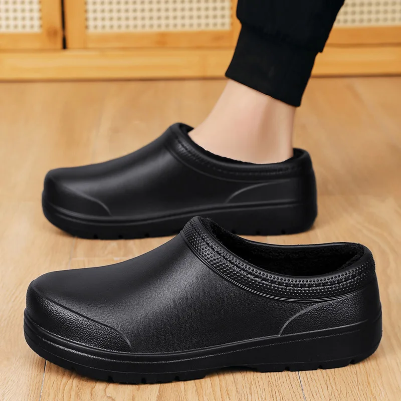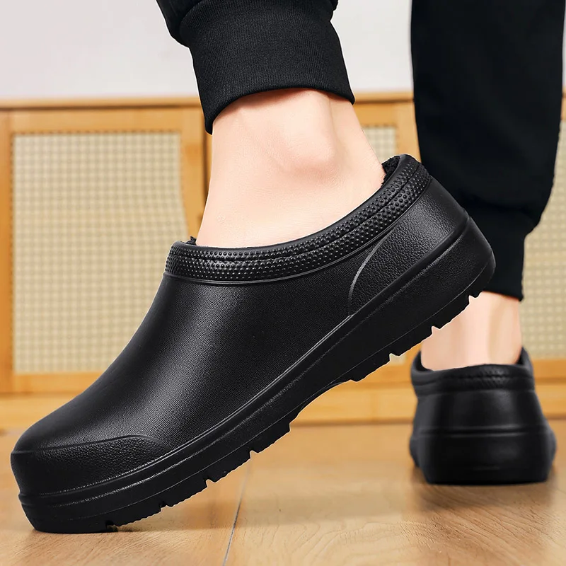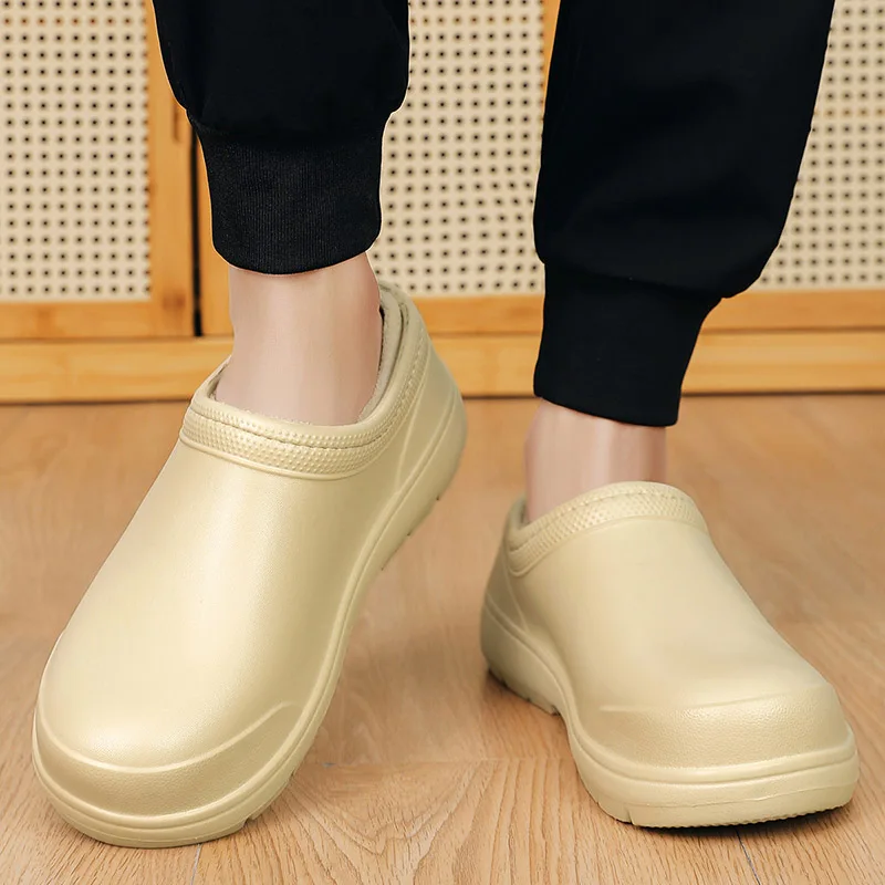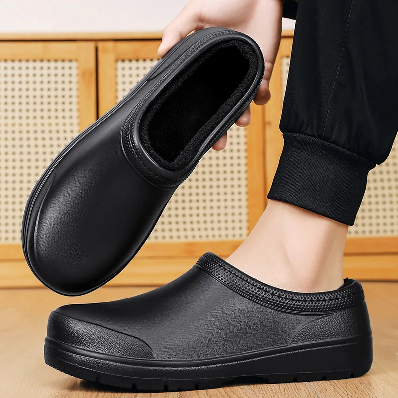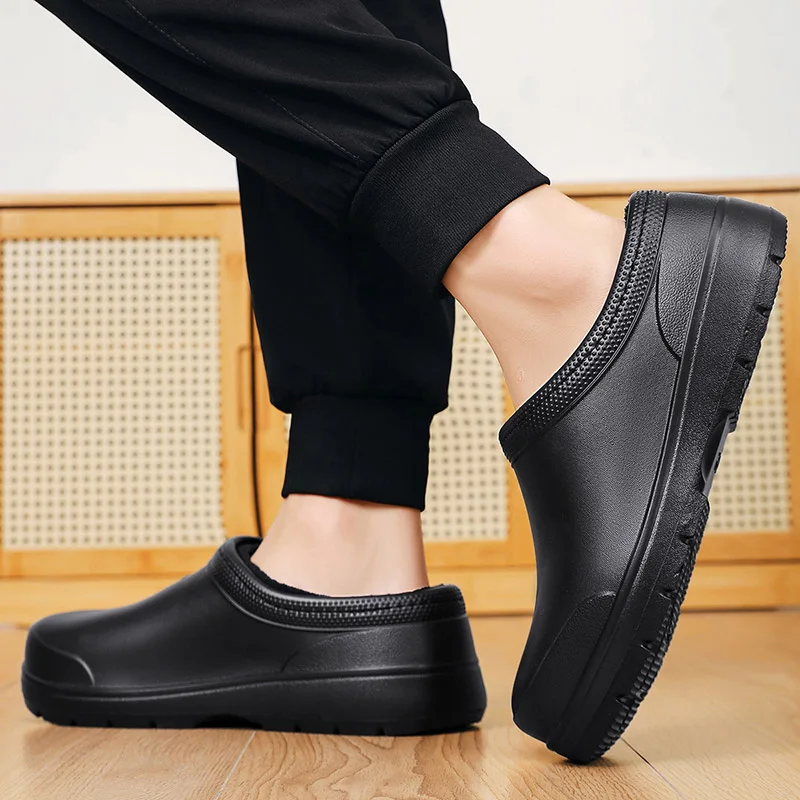 These non-slip kitchen shoes feature a solid pattern with a concise style, making them a practical yet fashionable choice for everyday wear. The shoes have a comfortable short plush lining, ensuring a cozy fit, and an EVA insole for added cushioning. The outsole, made of durable rubber, provides excellent traction and slip resistance. The slip-on closure type offers convenience and ease of use, making these shoes perfect for busy individuals who need to quickly get ready for work.