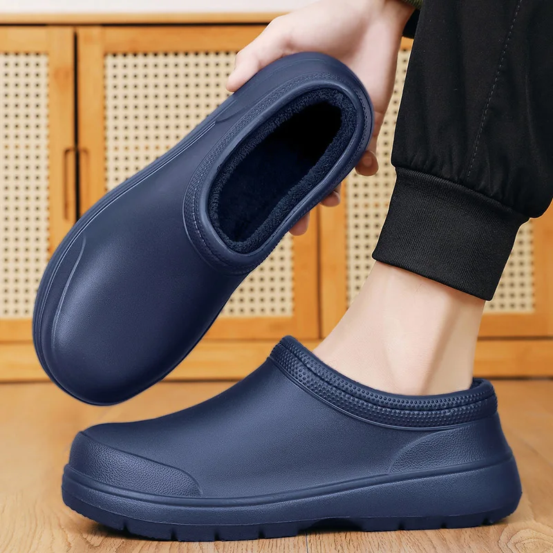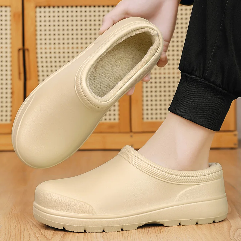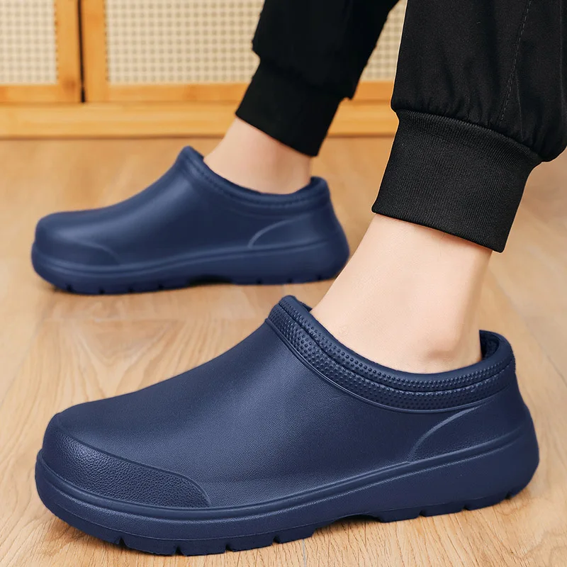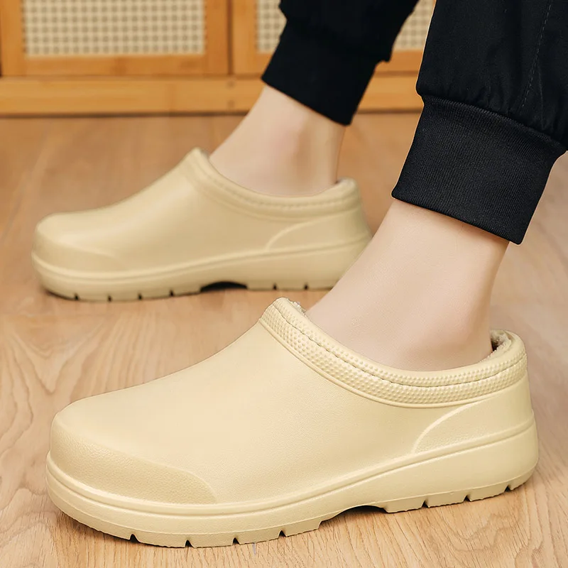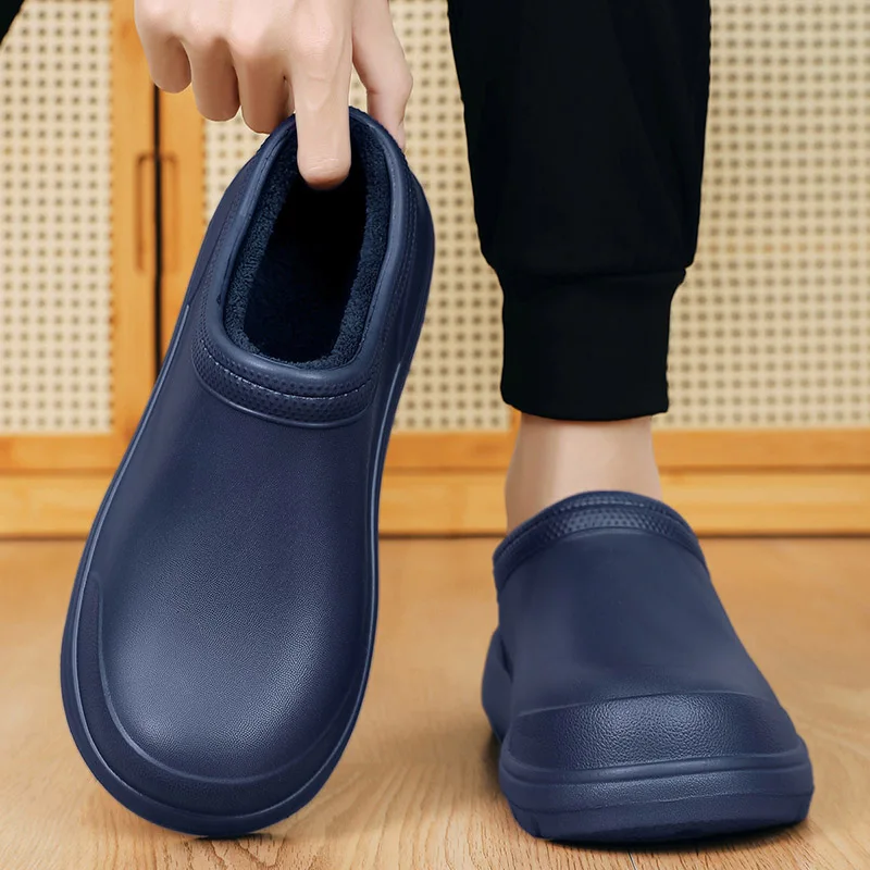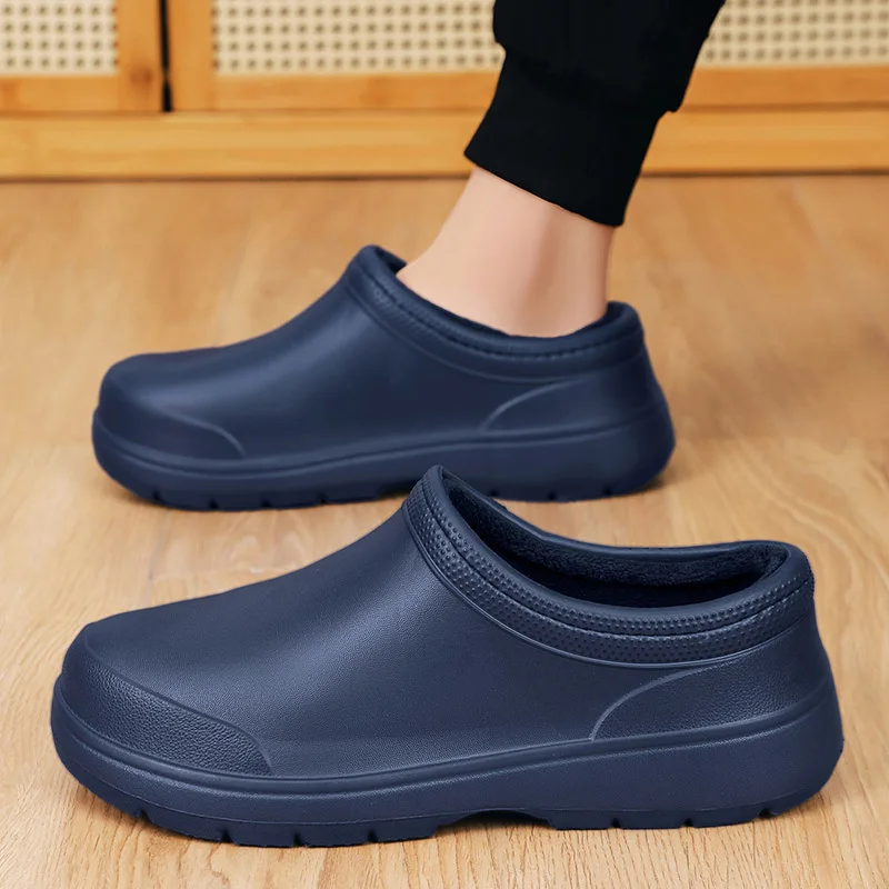 These non-slip kitchen shoes feature a solid pattern with a concise style, making them a practical yet fashionable choice for everyday wear. The shoes have a comfortable short plush lining, ensuring a cozy fit, and an EVA insole for added cushioning. The outsole, made of durable rubber, provides excellent traction and slip resistance. The slip-on closure type offers convenience and ease of use, making these shoes perfect for busy individuals who need to quickly get ready for work.